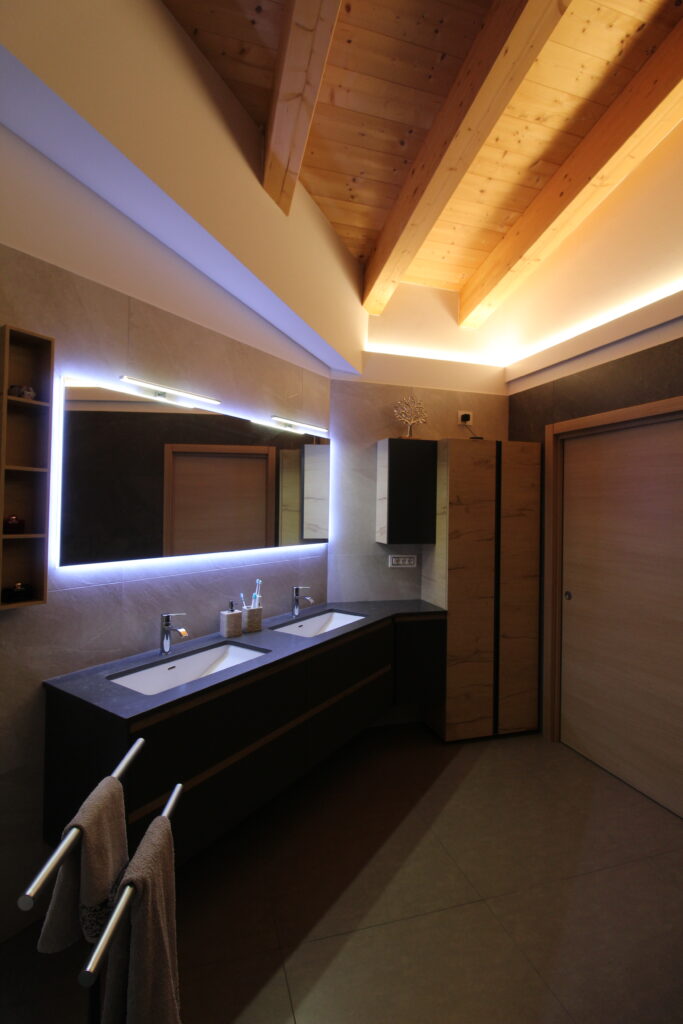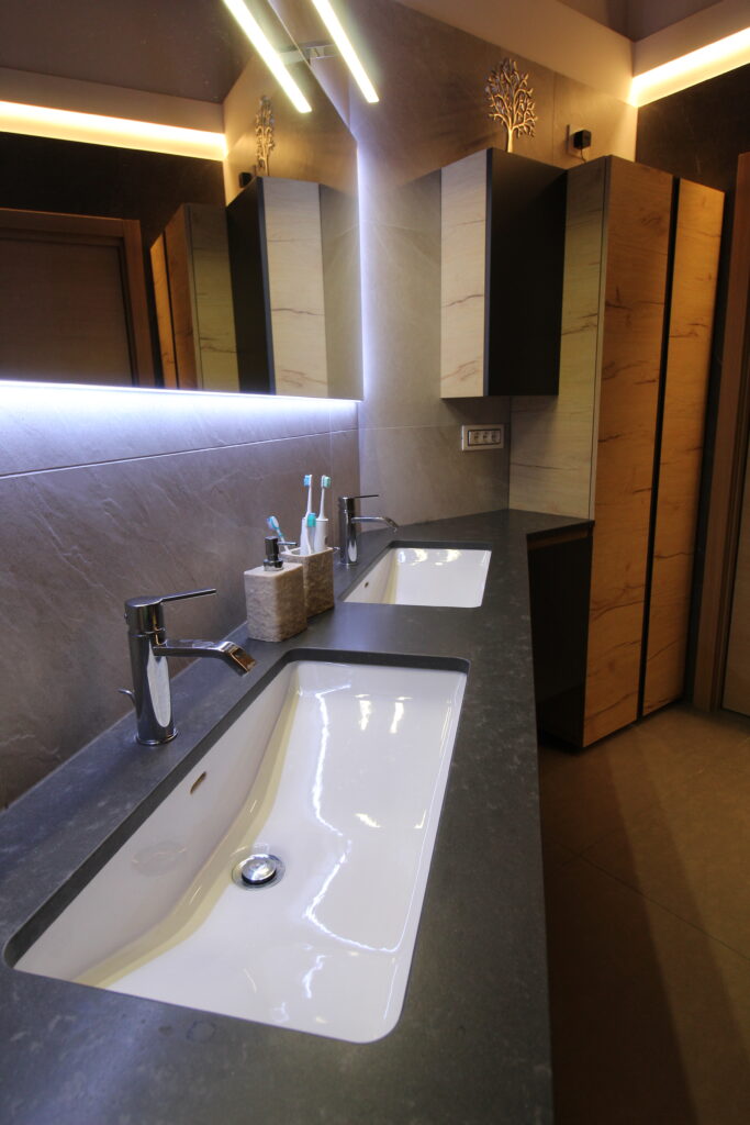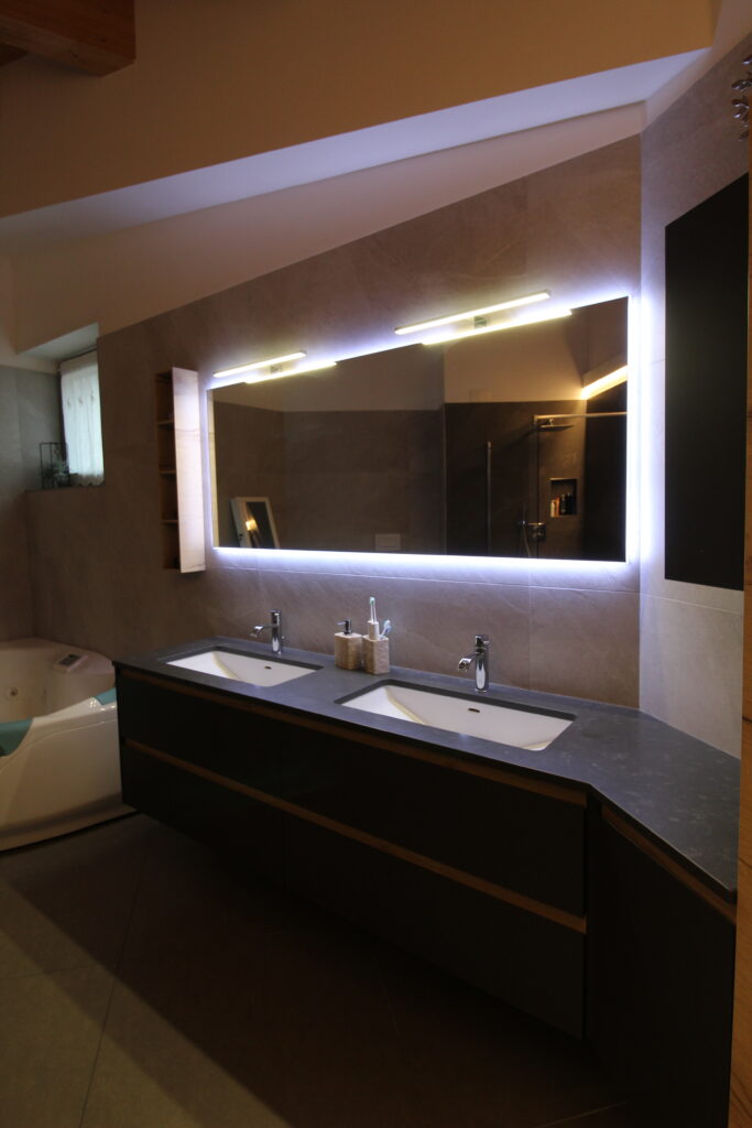 Un ambiente raffinato che unisce materiali naturali e design moderno. Il top in pietra scura ospita un doppio lavabo incassato, perfetto per la praticità quotidiana. Lo specchio retroilluminato dona profondità e luce, mentre i mobili in legno con venature naturali creano un contrasto caldo ed elegante. Una soluzione che combina funzionalità e stile, ideale per chi cerca comfort senza rinunciare al design.
