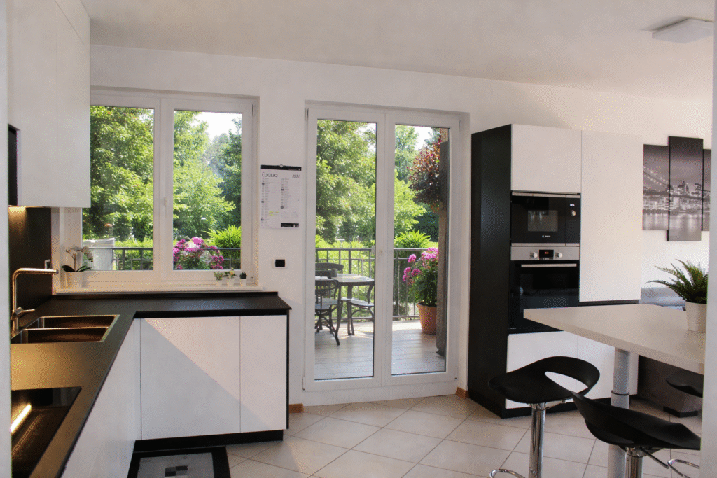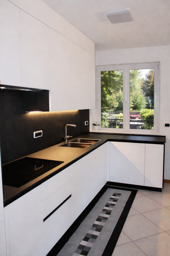 Black&White combina estetica e funzionalità in una struttura L-shaped ottimizzata. Top in finitura dark stone, ante in laccato opaco e illuminazione LED sottopensile garantiscono comfort operativo e massima pulizia formale. Ideale per ambienti moderni che richiedono ordine, efficienza e materiali di lunga durata.