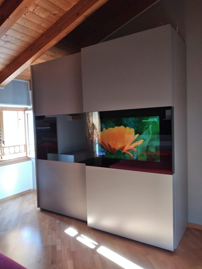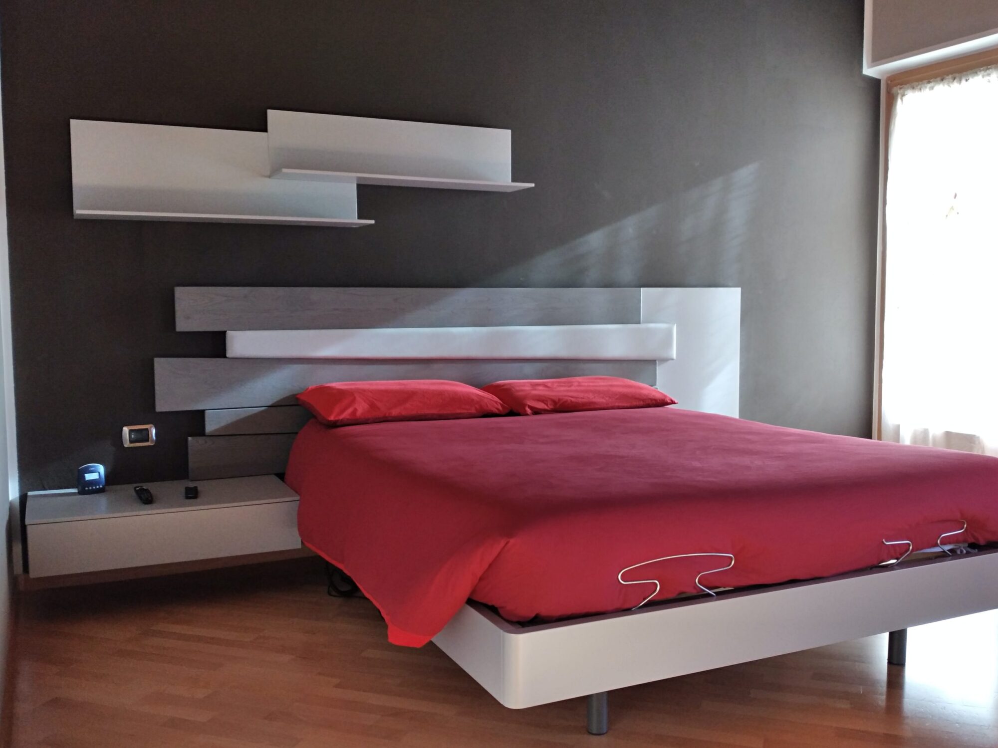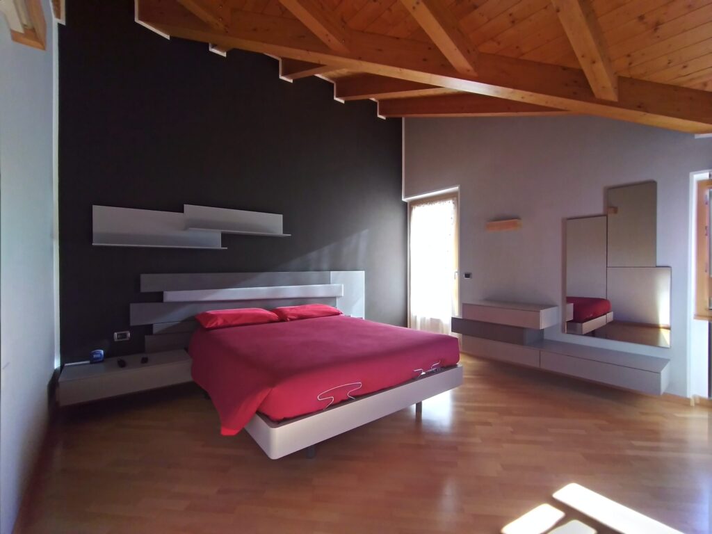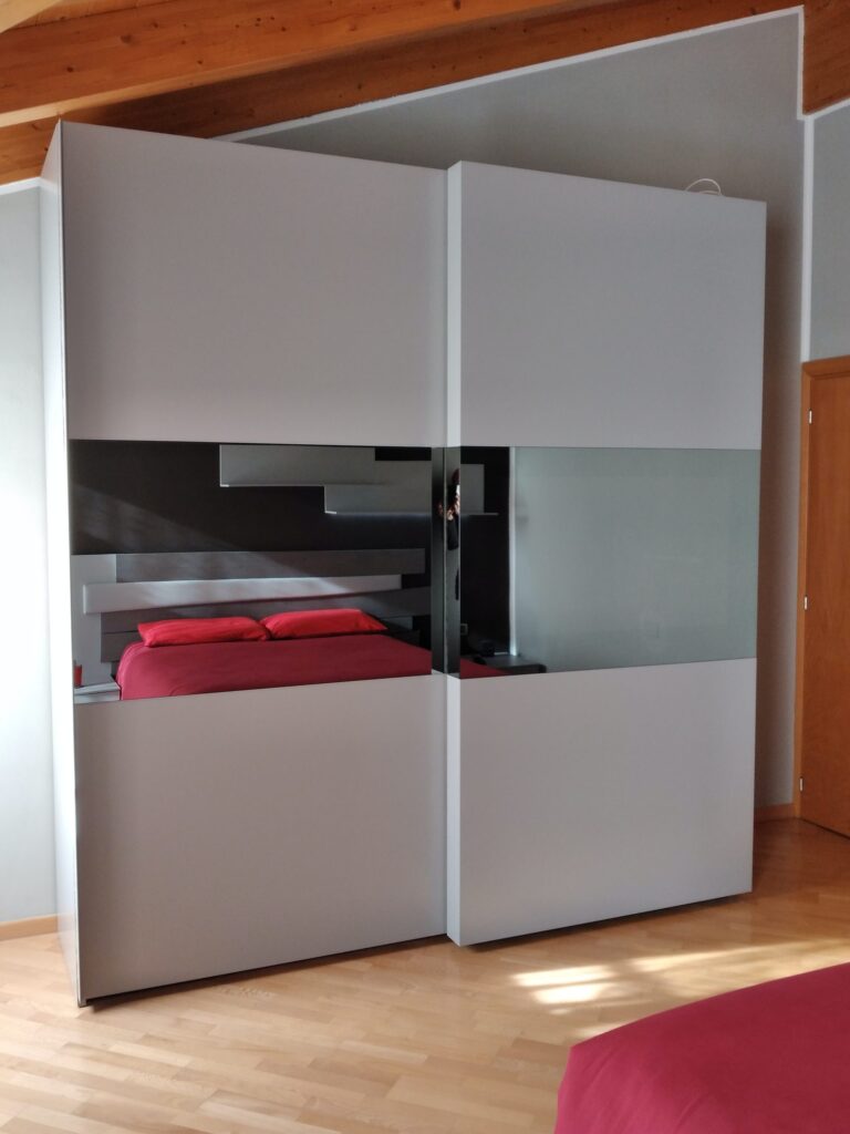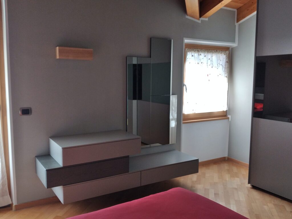 Camera in legno con dettagli in rovere grigio, elegante e contemporanea. Comò sospeso e armadio scorrevole con anta in vetro Stop Sol, predisposto per TV, per un ambiente funzionale e raffinato.