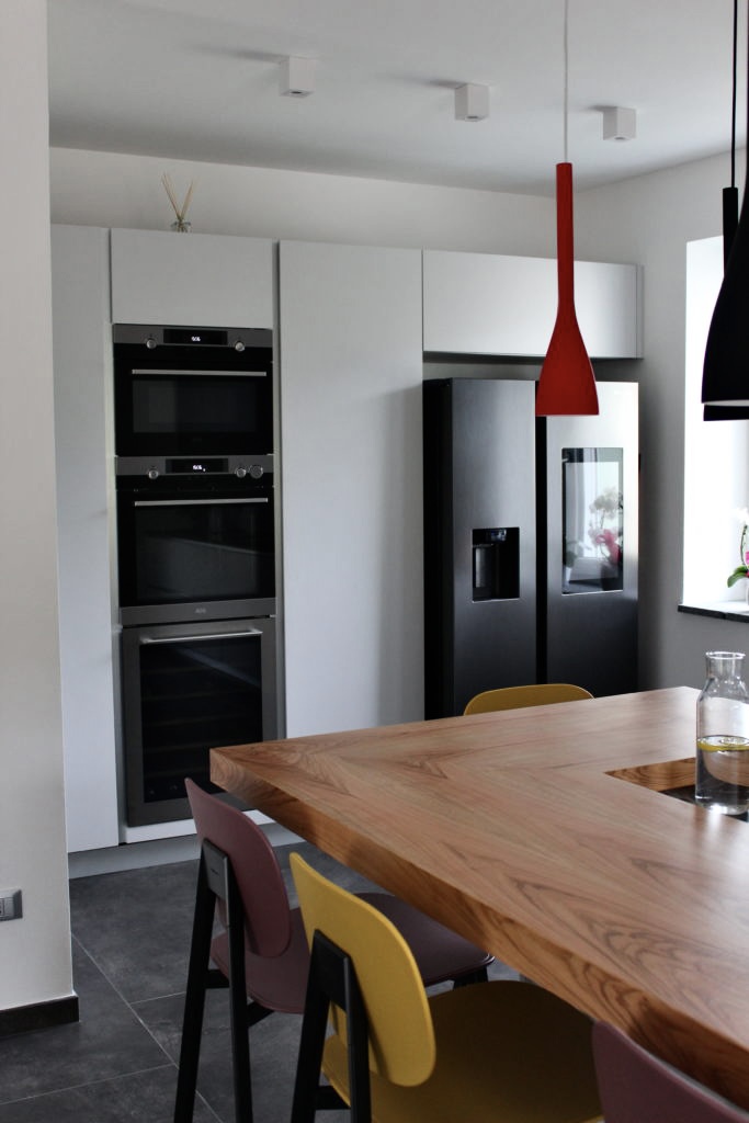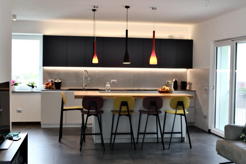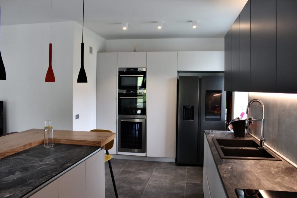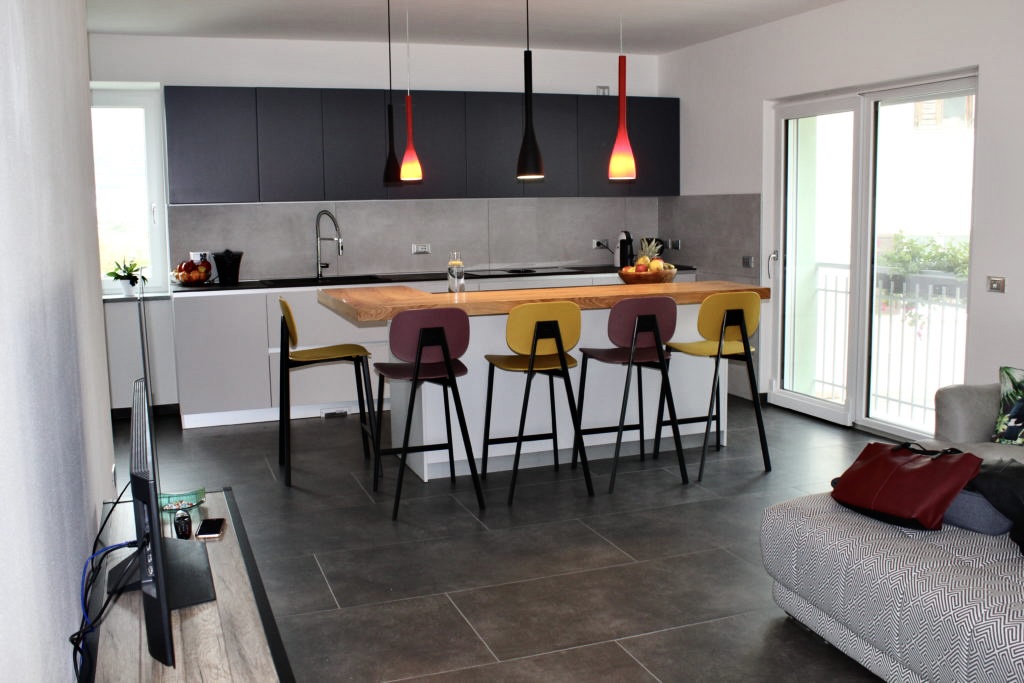 Una cucina moderna e armoniosa con ante a gola piatta, che esaltano la linearità e l’eleganza delle forme. Colonne e basi in grigio pioggia si combinano con pensili in laccato opaco grigio ardesia, creando un sofisticato gioco di tonalità. Il piano top in HPL stratificato effetto pietra conferisce resistenza e stile naturale alla zona operativa, dotata di piano cottura a induzione con cappa integrata AEG, soluzione pratica e tecnologica che mantiene pulite le linee. L’isola centrale è valorizzata da un piano snack rialzato in legno di olivo, completata dai sgabelli TATA di design, perfetta per convivialità e momenti informali. Una cucina che unisce estetica contemporanea e funzionalità quotidiana, ideale per ambienti raffinati e accoglienti.
