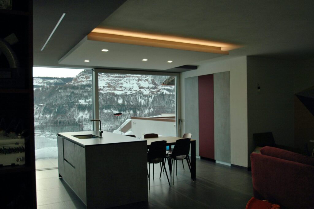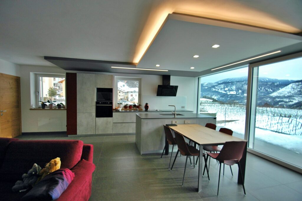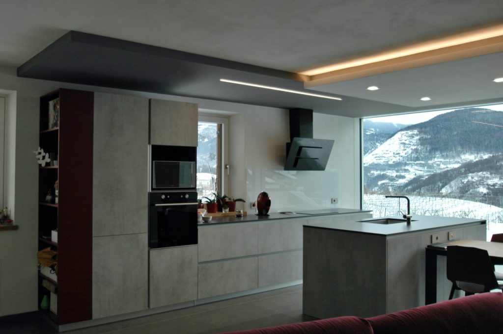 Design essenziale e moderno, caratterizzato dalla pratica gola in alluminio che valorizza l’anta in melaminico cemento polvere. I dettagli in laccato viola goffrato donano un tocco di originalità e personalità. L’isola centrale è completata da un piano in agglomerato SP2 con lavello sottotop, perfetto per combinare estetica e funzionalità. La zona pranzo è arricchita dal tavolo Diamante con piano laminato Cleaf rovere e dalle sedie modello Eva di Point, creando un ambiente elegante e accogliente, ideale per la convivialità quotidiana.