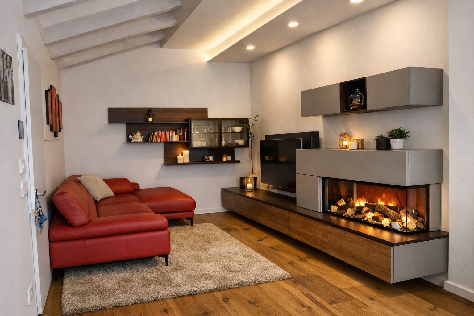 Un living contemporaneo e raffinato con il soggiorno modello SETA di Maronese, caratterizzato da basi sospese laccate e un caminetto elettrico incassato, che crea un’atmosfera calda e accogliente. Il pannello TV orientabile unisce funzionalità e design, permettendo la massima flessibilità per la visione. Il divano in pelle Doimo Salotti completa l’ambiente, con linee eleganti e comfort superiore, per un soggiorno che coniuga stile moderno e praticità quotidiana.